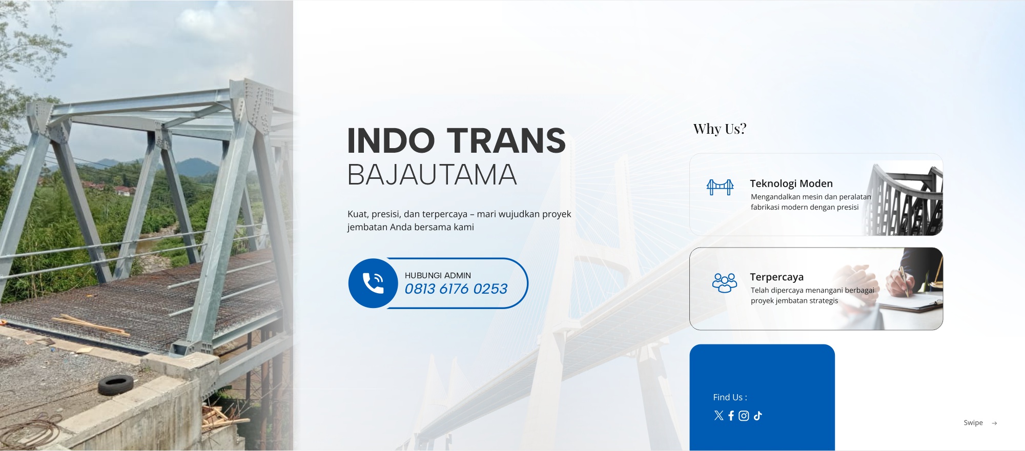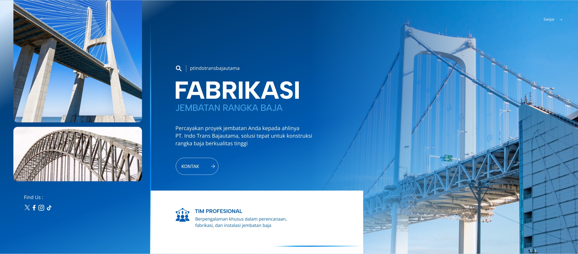 PT. Indo Trans Bajautama adalah perusahaan yang bergerak di bidang fabrikasi dan konstruksi jembatan baja, dengan komitmen menghadirkan solusi infrastruktur yang kuat, andal, dan tahan lama.